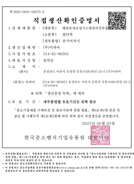필터 직접생산확인증명서